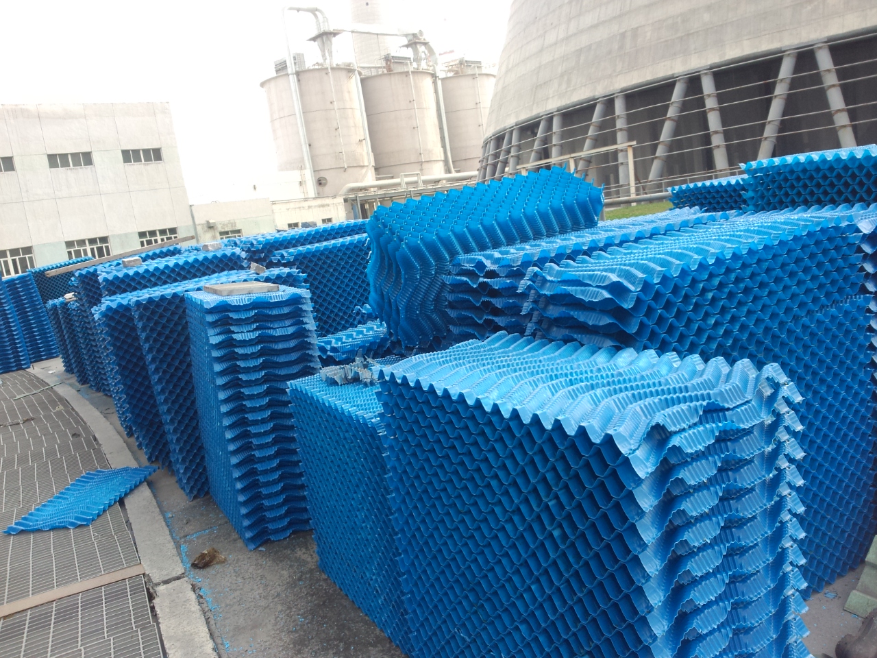 該填料結(jié)構(gòu)設(shè)計新穎,親水面積大,冷卻效果好,主要用于工業(yè)逆流冷卻塔,電廠雙曲線水泥冷卻塔。
