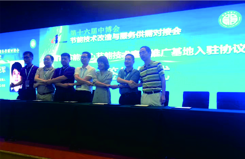 公司董事長陳程(左二)在第十六屆中博會節(jié)能技術改造與服務供需對接會上簽約留影
